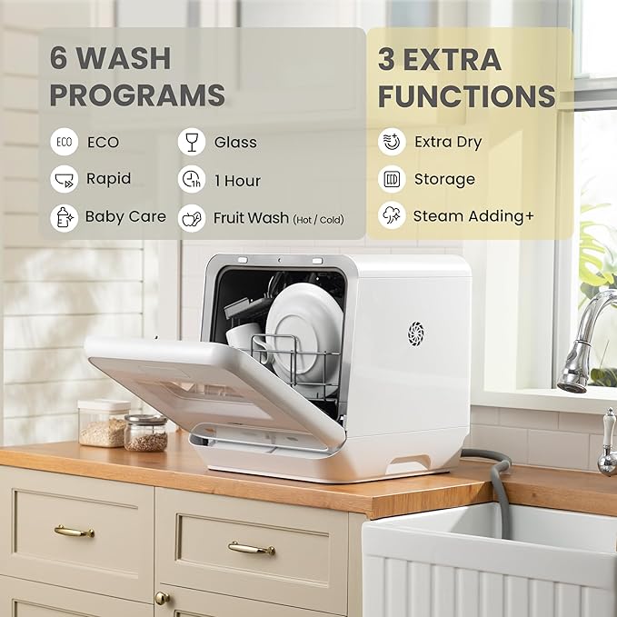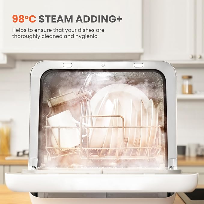 With 98℃ Steam Adding+ for superior hygiene, 72-hour ventilated storage to keep dishes fresh, and a 5L water tank that requires no plumbing, it is perfect for small UK households, flats, student dorms, cabins, and caravans. Compact, portable, and energy-efficient (Class D), it saves 20.7% energy compared to Class G dishwashers. Sleek white design, touch controls, and included components like drain hose, fruit basket, and inlet hose make it a premium and convenient solution for UK kitchens. Enjoy reliability, efficiency, and top-quality cleaning in the United Kingdom with COMFEE’.