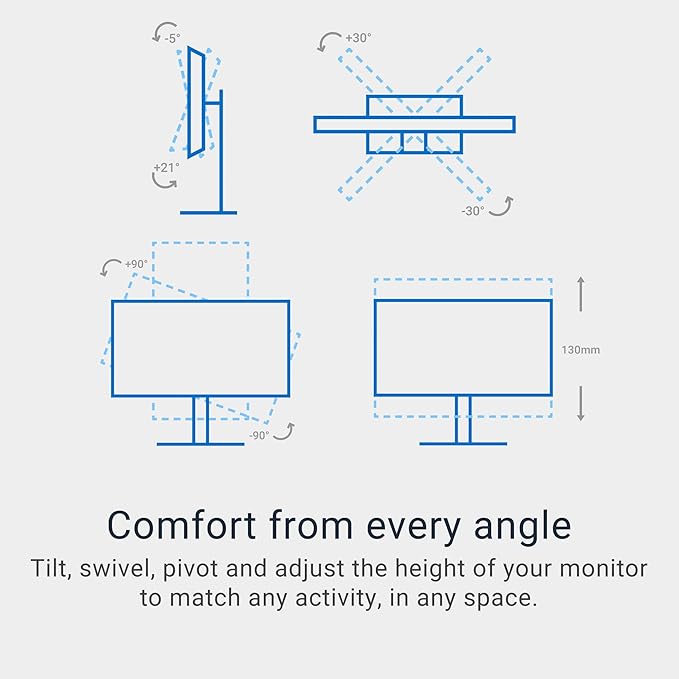 Connectivity is effortless with two USB-C ports (supporting data, video, and up to 65W charging), dual HDMI 2.1 ports, and two USB-A ports — offering flexibility for laptops, consoles, and peripherals. The height-adjustable stand, tilt, swivel, and pivot features make it easy to find the perfect viewing angle for productivity or relaxation.