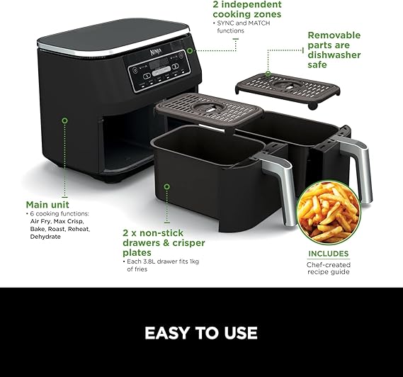 Enjoy Max Crisp, Air Fry, Roast, Bake, Reheat, and Dehydrate functions while using little to no oil, helping you create the best golden, crispy results with up to 75% less fat. With its generous 7.6L capacity, non-stick dishwasher-safe drawers and energy-saving performance, it’s the perfect choice for households across the United Kingdom who want faster, smarter and healthier cooking every day.